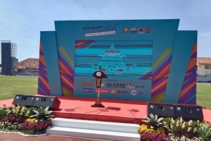 Backdrop sebaiknya dipasang tepat di belakang area utama panggung agar menjadi fokus visual saat acara berlangsung.